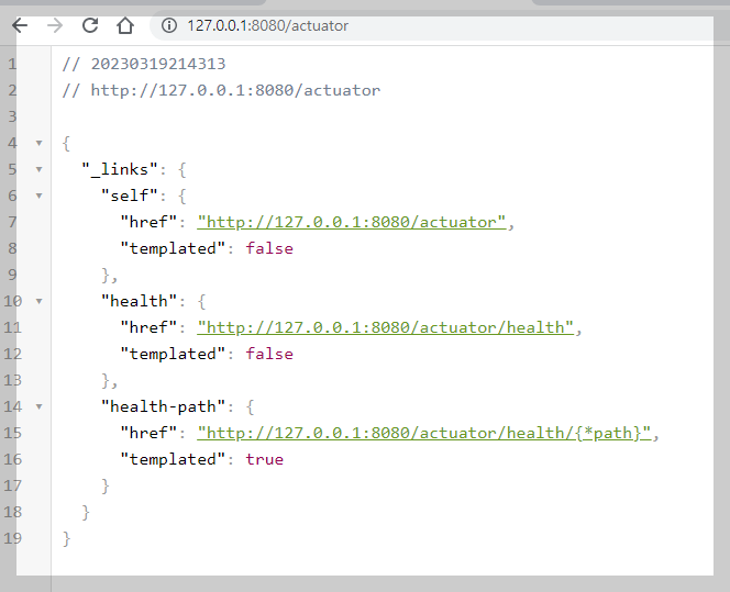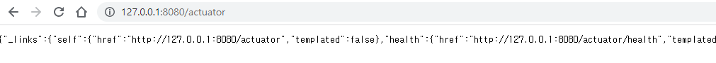 spring boot 구동시킨 상태에서 크롬 브라우저로 http://127.0.0.1:8080/actuator 를 입력해봅시다. 아래처럼 json 정보가 나옵니다. 저는 json 관련 크롬 확장프로그램을 설치했기에 아래처럼 예쁘게? 나옵니다.