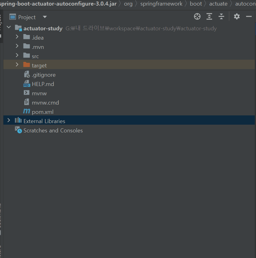 intellij 의 maven 의존성 부분을 보니 아래처럼 spring-boot-starter-actuator 는 내부적으로 micrometer 라이브러리를 사용하고, auto configuration을 위한 라이브러리리(spring-boot-actuator-autoconfigure)를 포함하는걸 알 수 있습니다.