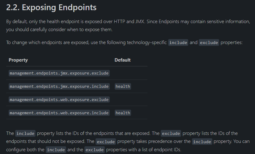 아래처럼 default 로 web과 jmx 에 대해 health 라는 endpoint 만 노출되도록 되어 있습니다.