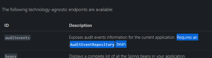 아래 auditevents 라는 endpoint 는 AuditEventRepository 타입의 bean이 등록되어 있어야 동작을 한다고 적혀있습니다.