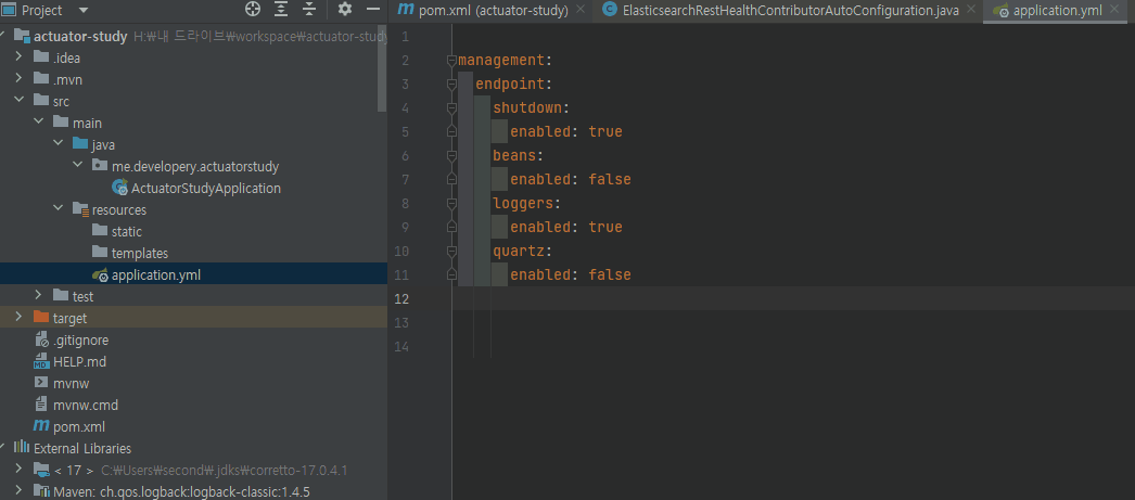 intellij 에서 spring boot assistent 라는 플러그인을 설치하면 yml 파일에 대해 자동 완성이 지원됩니다. 그래서 아래처럼 철자 하나하나 외우지 않아도 쉽게 설정이 가능합니다. 주의할 것은 management.endpoint 도 있고 management.endpoints 도 있다는 겁니다. 서로 역할이 다르니 오타에 유의하세요.