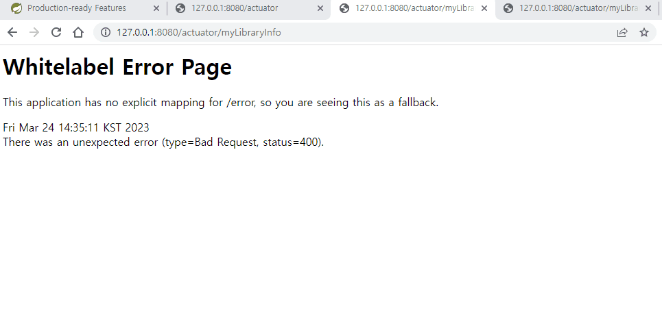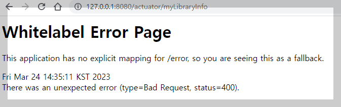 이제 spring boot 재구동하고 http://127.0.0.1:8080/actuator/myLibraryInfo 를 웹브라우저에서 실행하면 아래처럼 400 status 코드가 리턴됩니다.