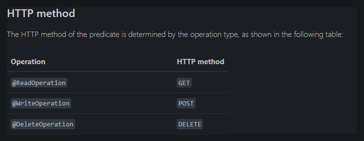 actuator 에서는 이런 문제를 해결하기 위해 아래처럼 @WriteOperation, @DeleteOperation 이라는 추가 어노테이션이 제공되며, 각 어노테이션별 매핑되는 HTTP Method 는 아래와 같습니다. 상식적이기에 외울것도 없어보입니다.