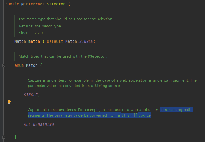 Selector 어노테이션을 내부를 보면 아래처럼 match 라는 필드가 있으며, 해당 필드는 SINGLE, ALL_REMAINING 중 하나를 넣을 수 있습니다. 하이라이트한 부분을 읽어보면 알 수 있듯이 모든 path 부분을 캡쳐하고, path 구분을 위해 String[] 형태로 변환된다고 적혀있습니다.