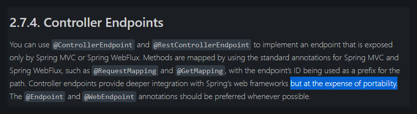 아래 공식가이드에서도 @RestControllerEndpoint 라는 어노테이션을 이용하면 일반적인 rest controller 구현하듯이 @GetMapping , @PostMapping 등을 써서 endpoint 를 만들수 있다고 합니다. 다만 호환성을 위한 비용이 발생할 수 있으니 특별한 이유가 아니면 @EndPoint 나 @WebEndpoint 를 이용해서 구현하라고 권장하고 있습니다.