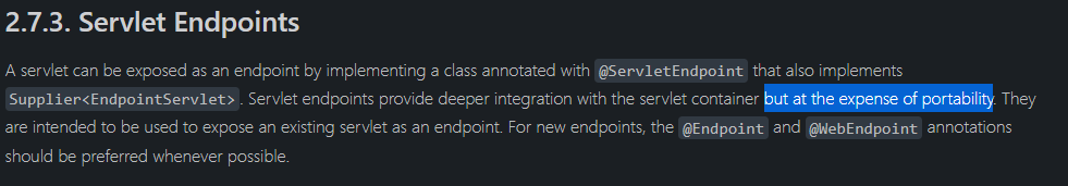 @ServletEndpoint 를 이용해서 구현할 수 있으나 동일하게 호환성을 위한 비용이 발생할 수 있으니 가급적 @Endpoint 를 이용하라고 권장하고 있습니다.