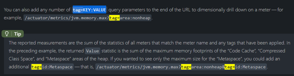 이후 아래처럼 위 rest api를 호출한후 actuator 에서 값을 보면 tag 들이 나오며, tag를 통해 필터링된 값들을 확인할 수 있습니다.
