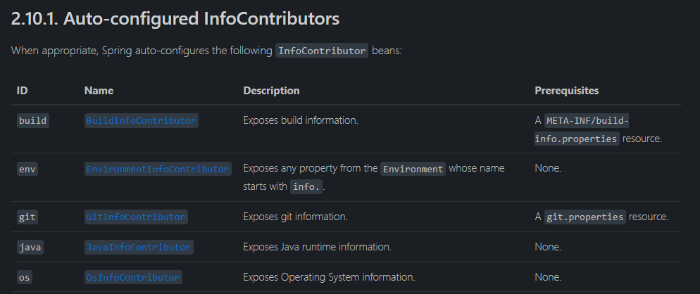 https://youtu.be/OxXLOLVkXnU 이번시간에는 info endpoint 에 대해 알아보겠습니다. actuator 자체가 주로 정보를 제공하는 기능이라서 info endpoint 라는 이름이 와닿지 않습니다. 기본 제공 info endpoint 이름 그대로 정보성 endpoint 인데, spring boot 에서는 아래 5가지를 기본 제공해주고 있습니다. 각 항목이 어떤 정보를 보여주는지는 차차 알아보기로 하고, 우선 prerequisites 즉 선결조건이 있는게 build 와 git 입니다. 선결조건인 info.properties 나 git.properties 파일이 없다면 disable 된다고 봐야 하며, 나머지 3가지는 기본이 disable 되어 있습니다. 결국 별도 설정을 하지 않..